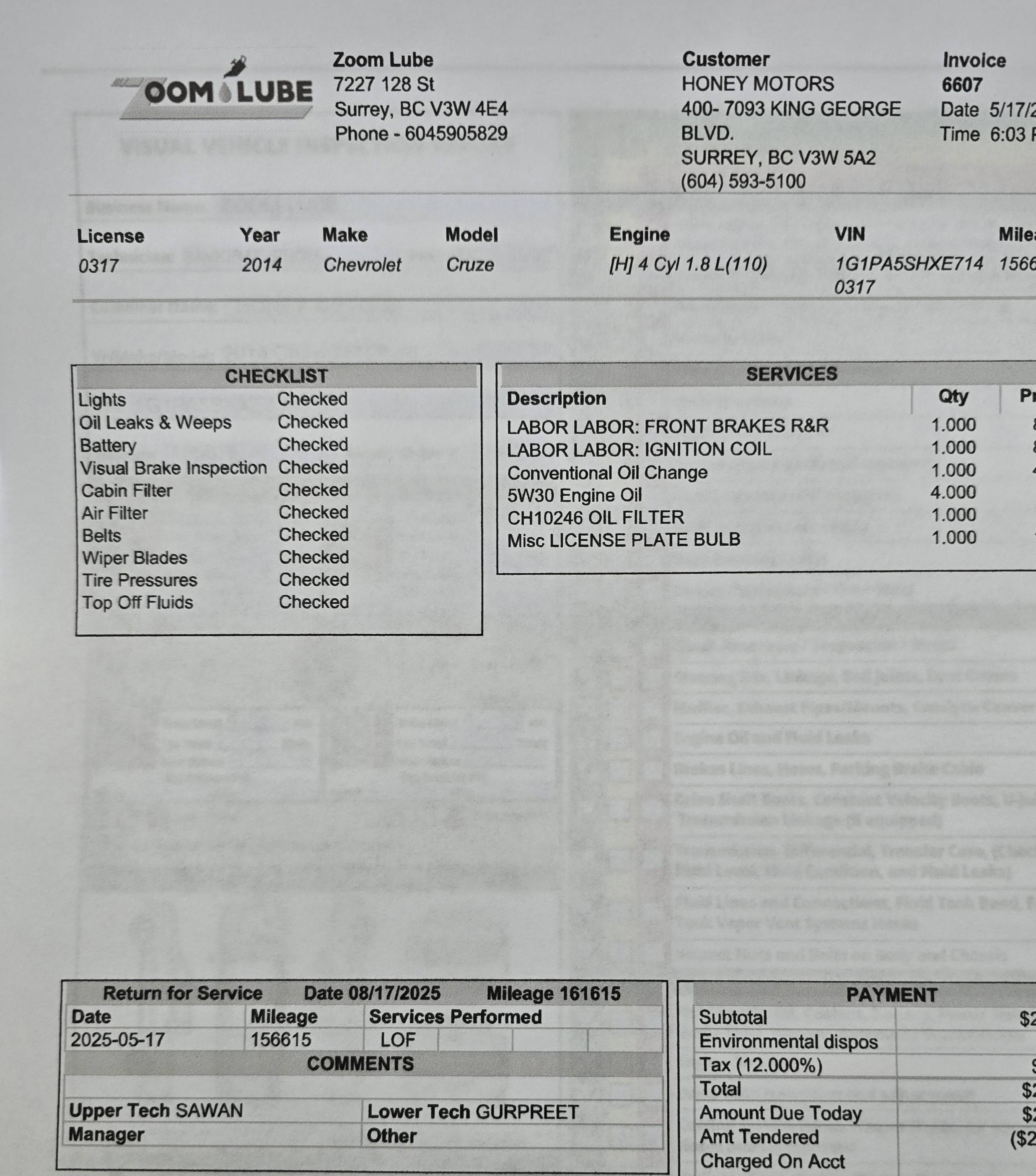 - Oil Change and Filter